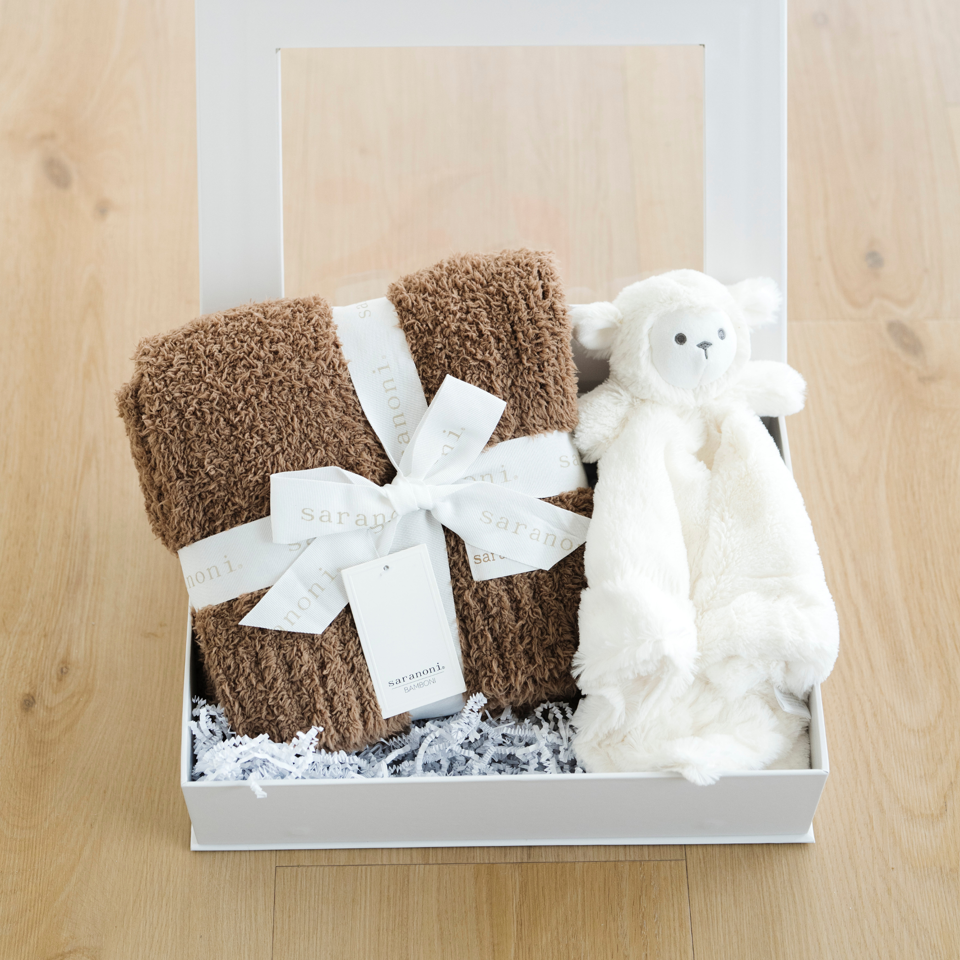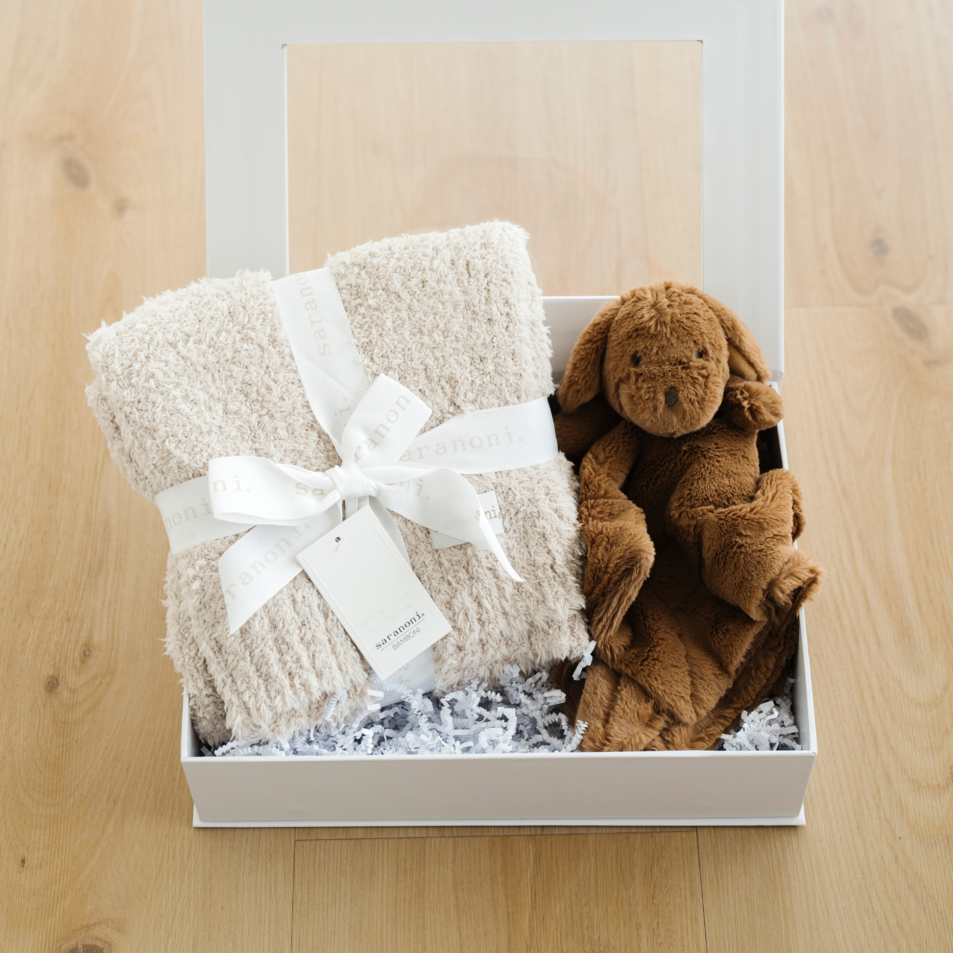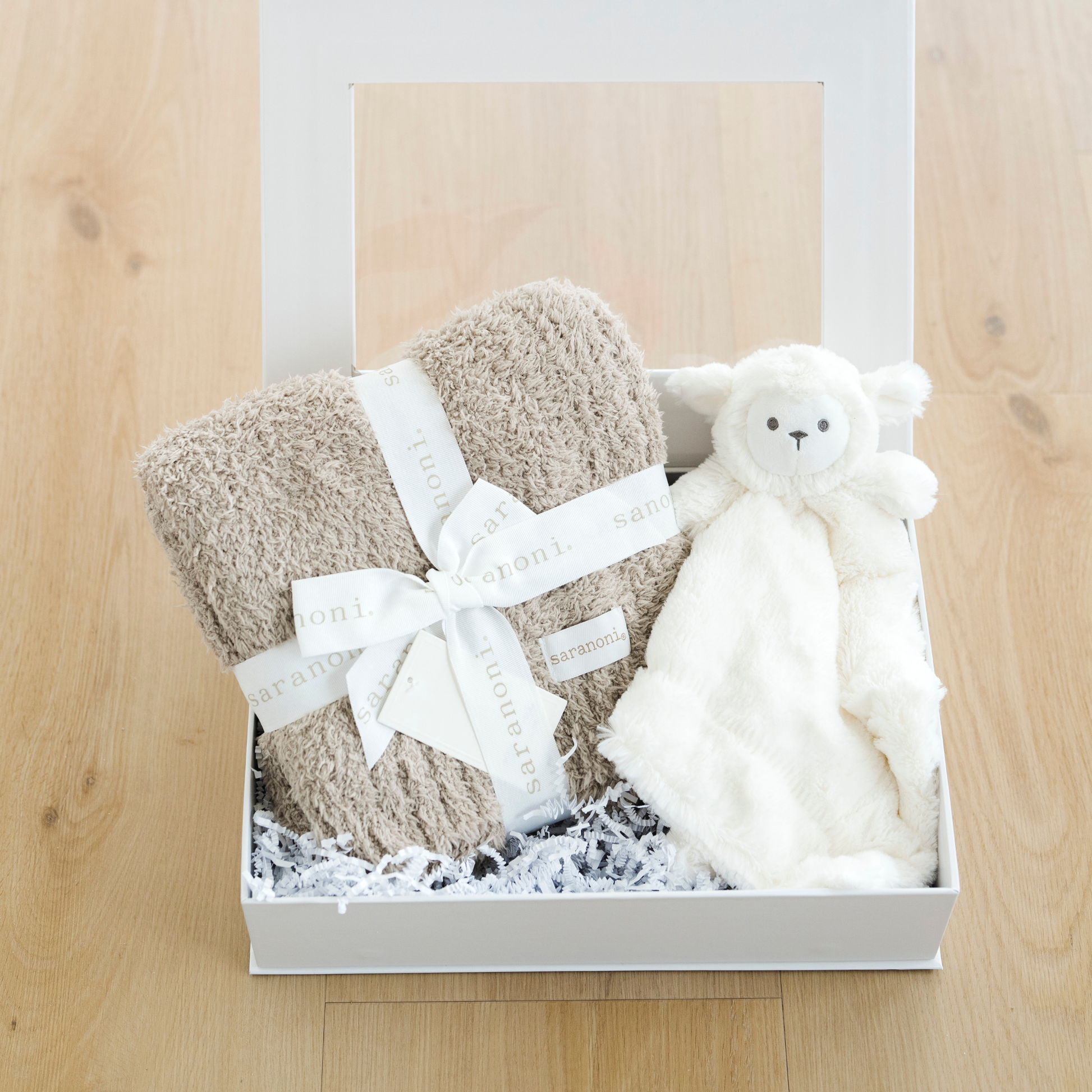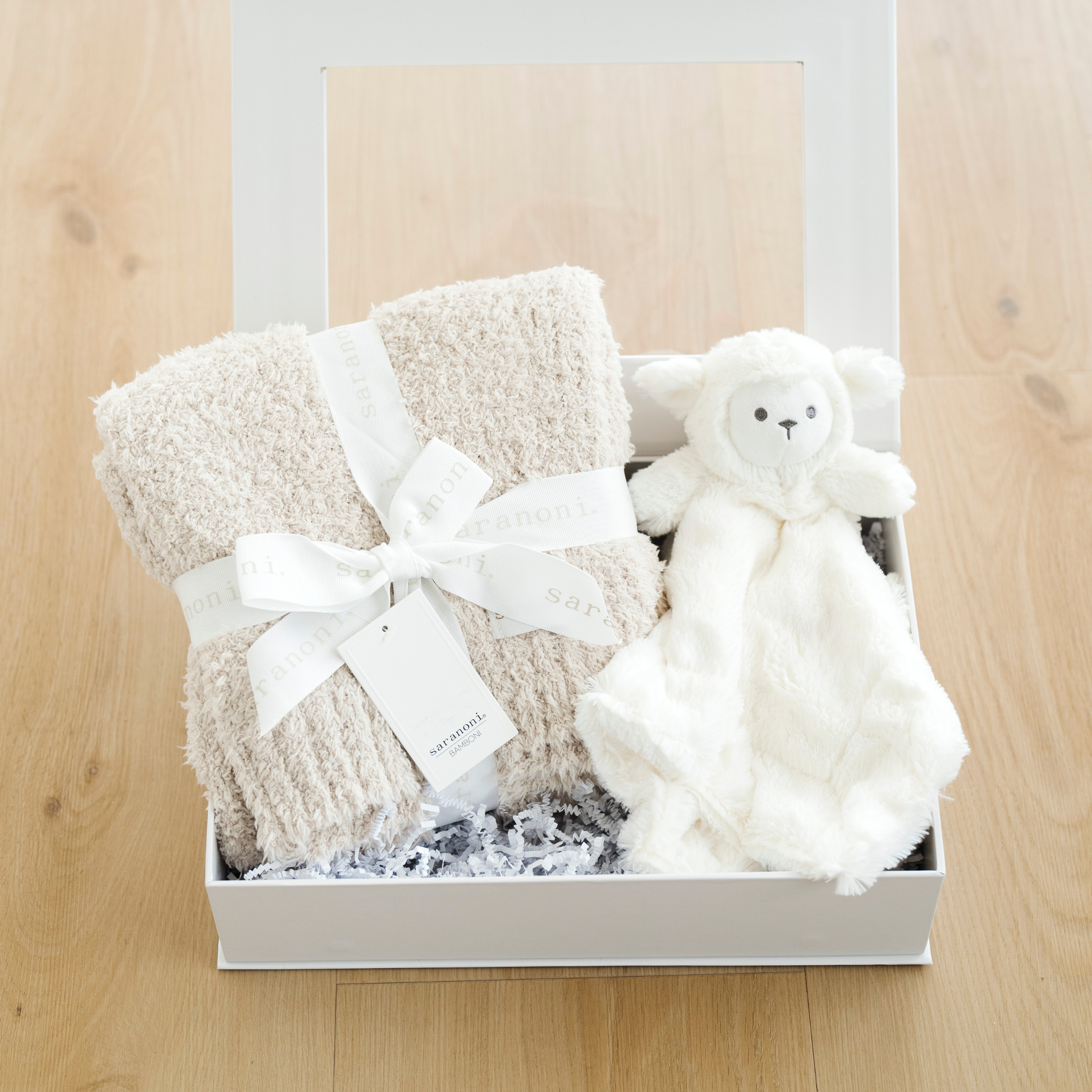 Our Sweet Beginnings Gift box comes with a Bamboni Receiving Blanket & Stuffed Animal Lovey.