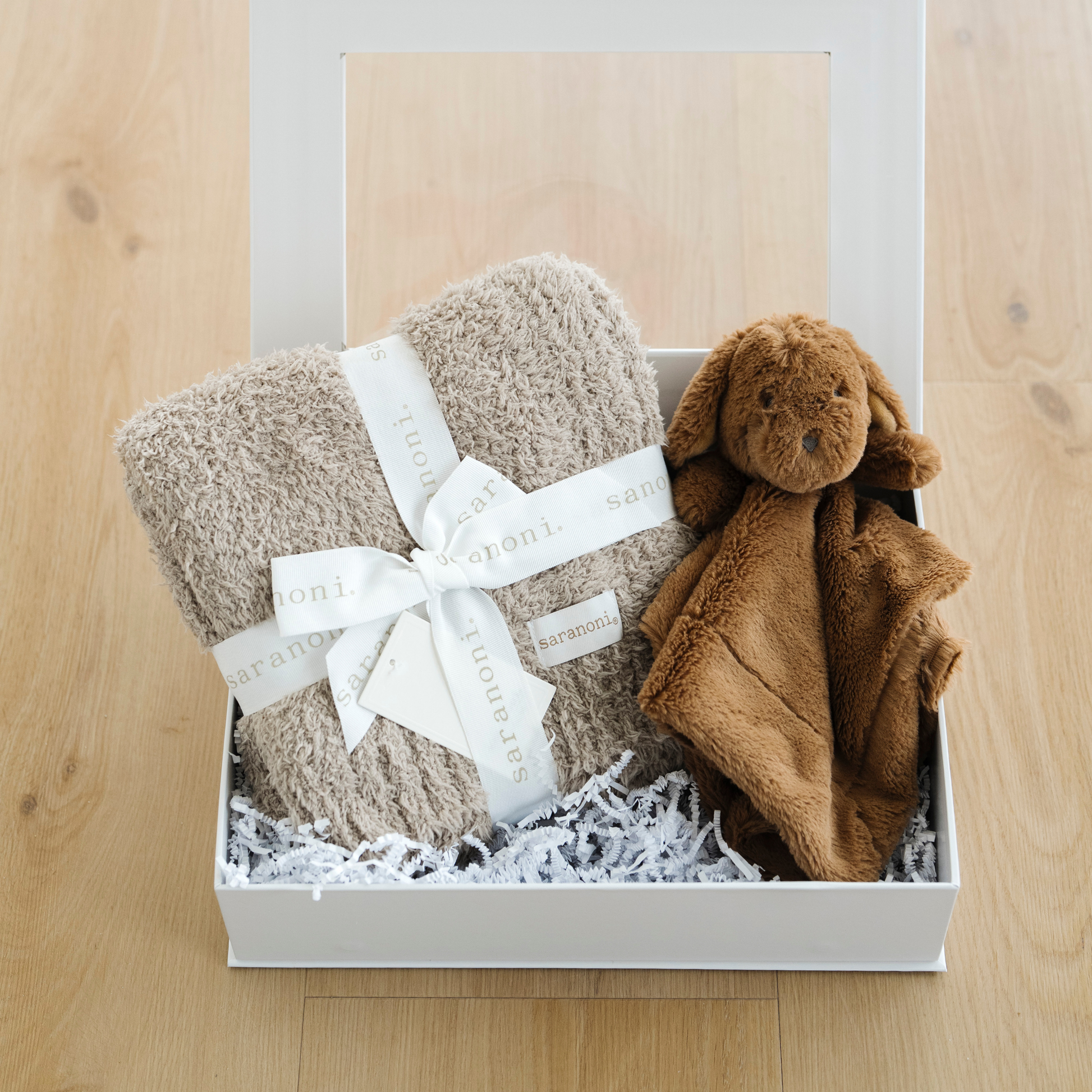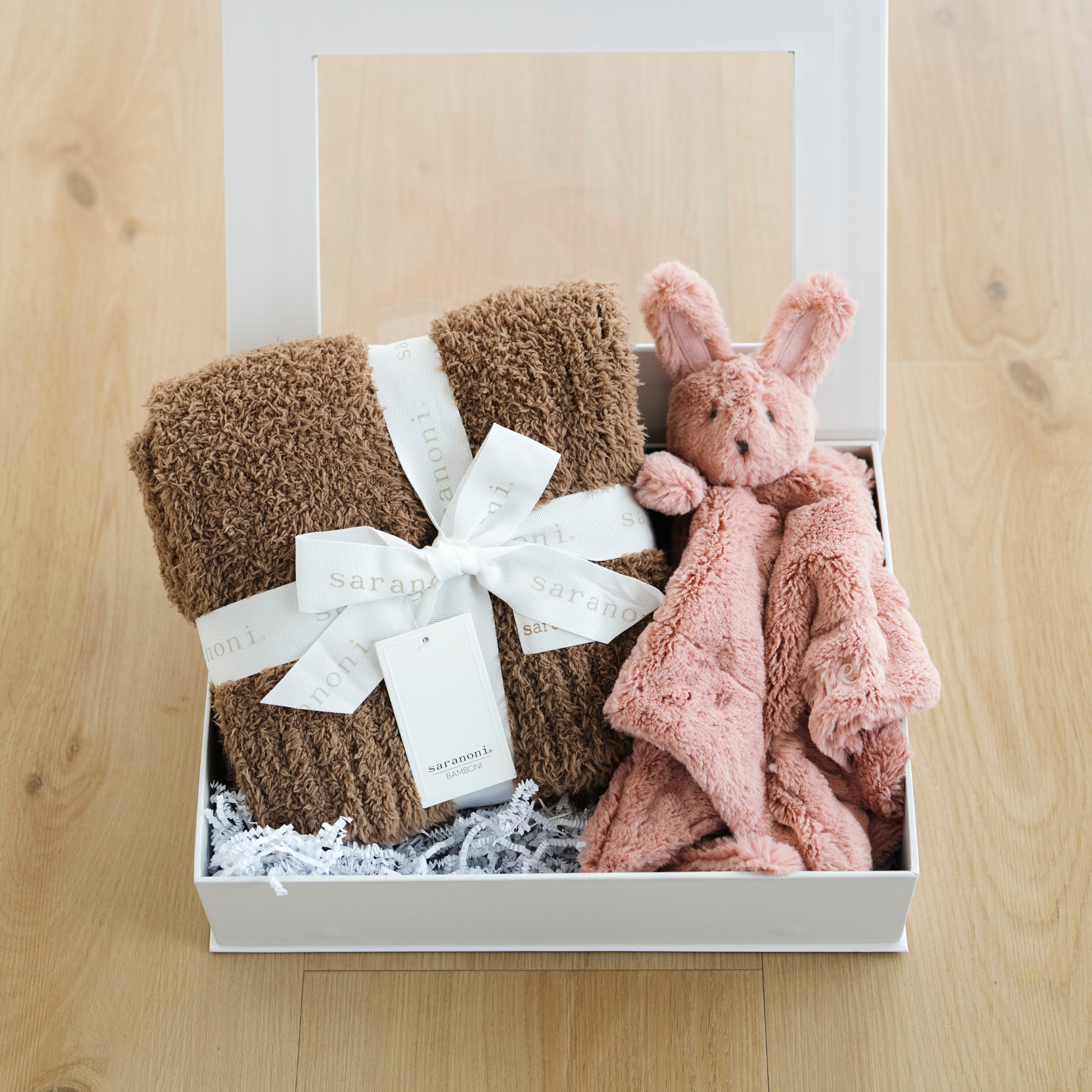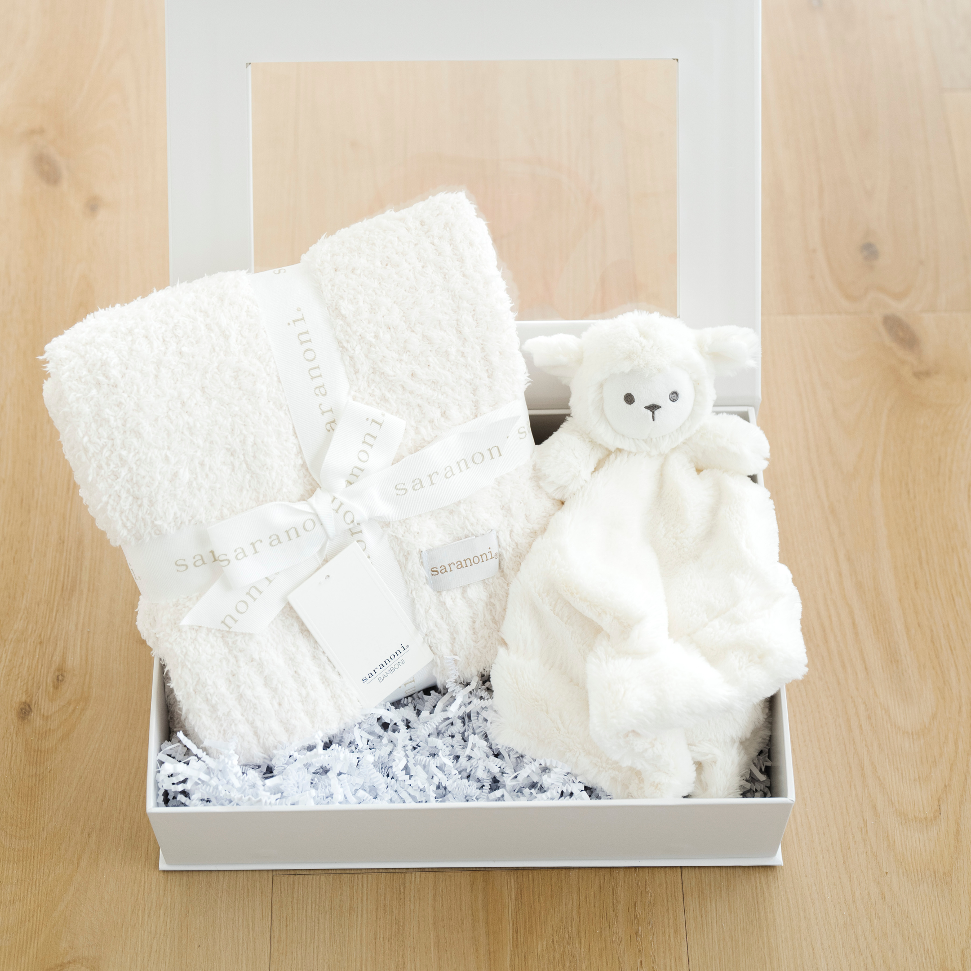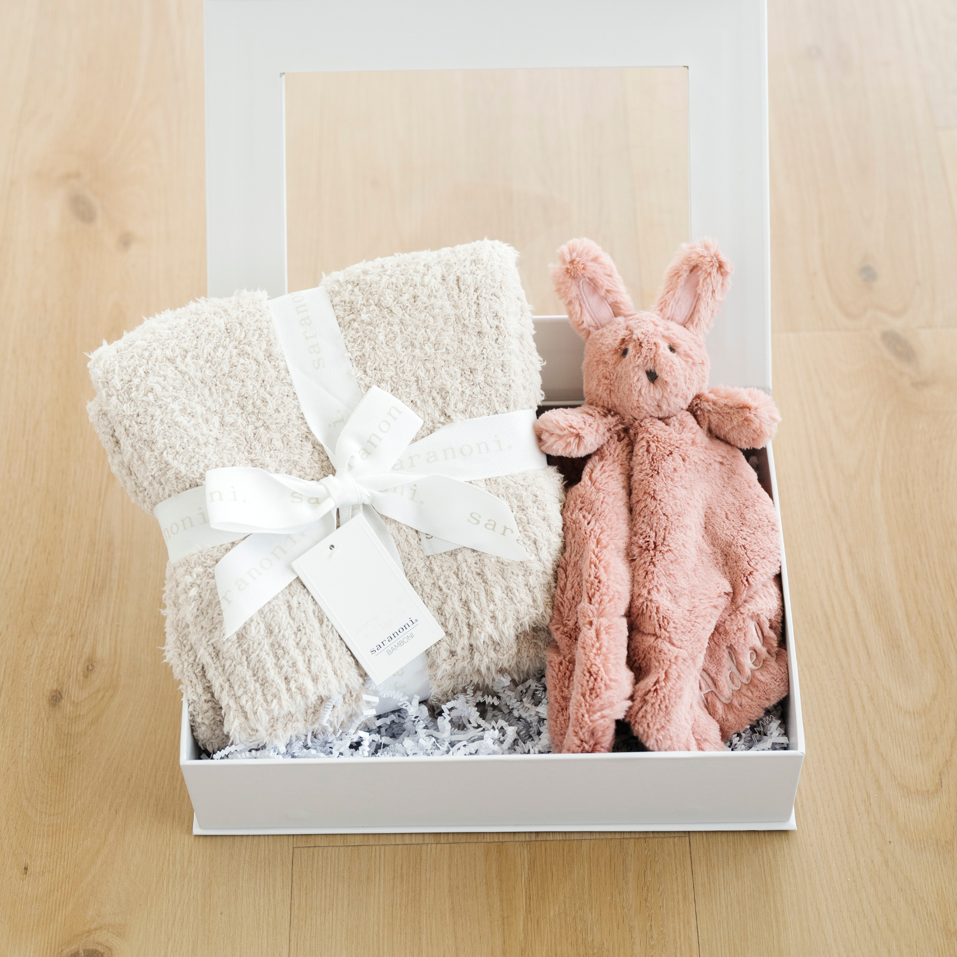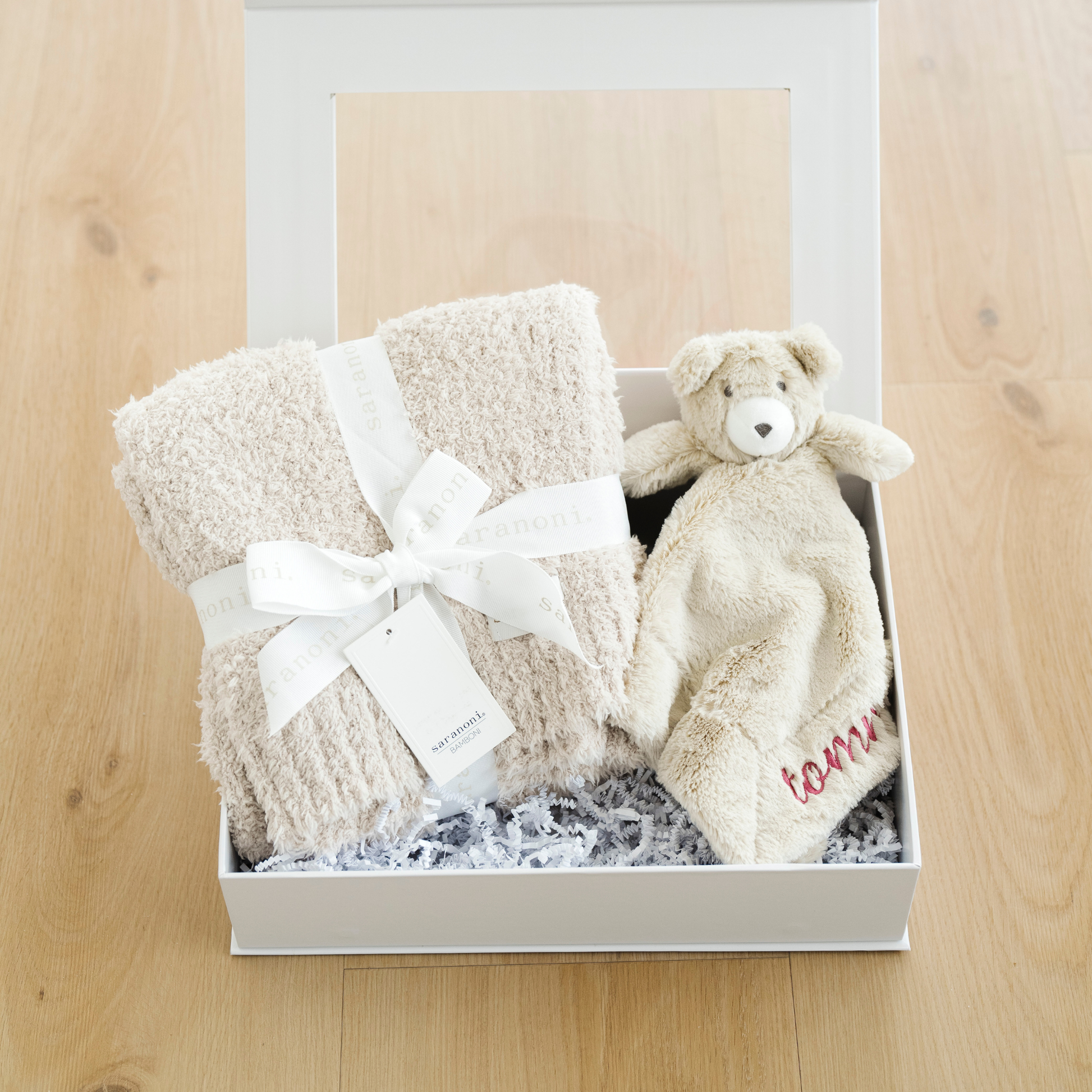 Our Sweet Beginnings Gift box comes with a Bamboni Receiving Blanket & Stuffed Animal Lovey.