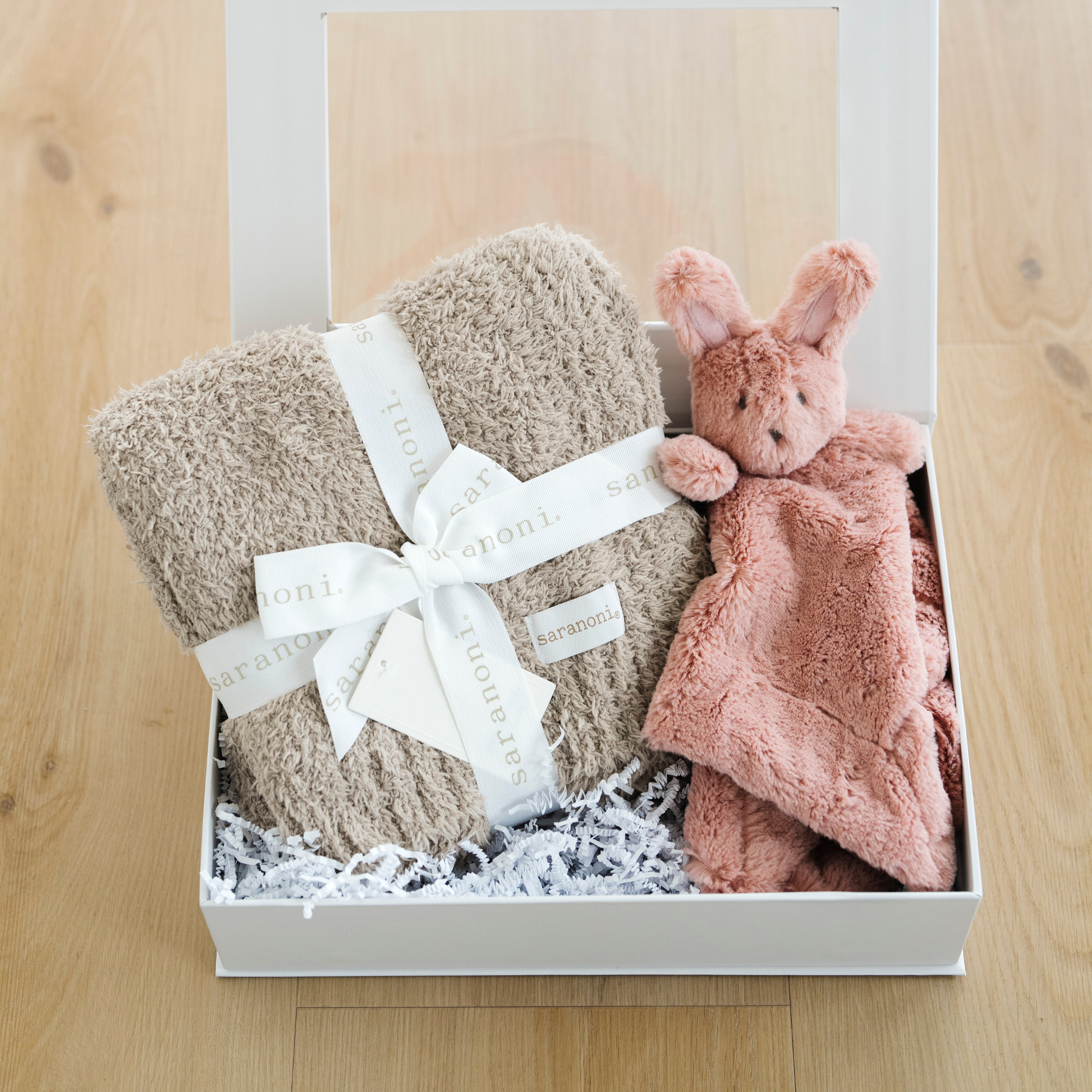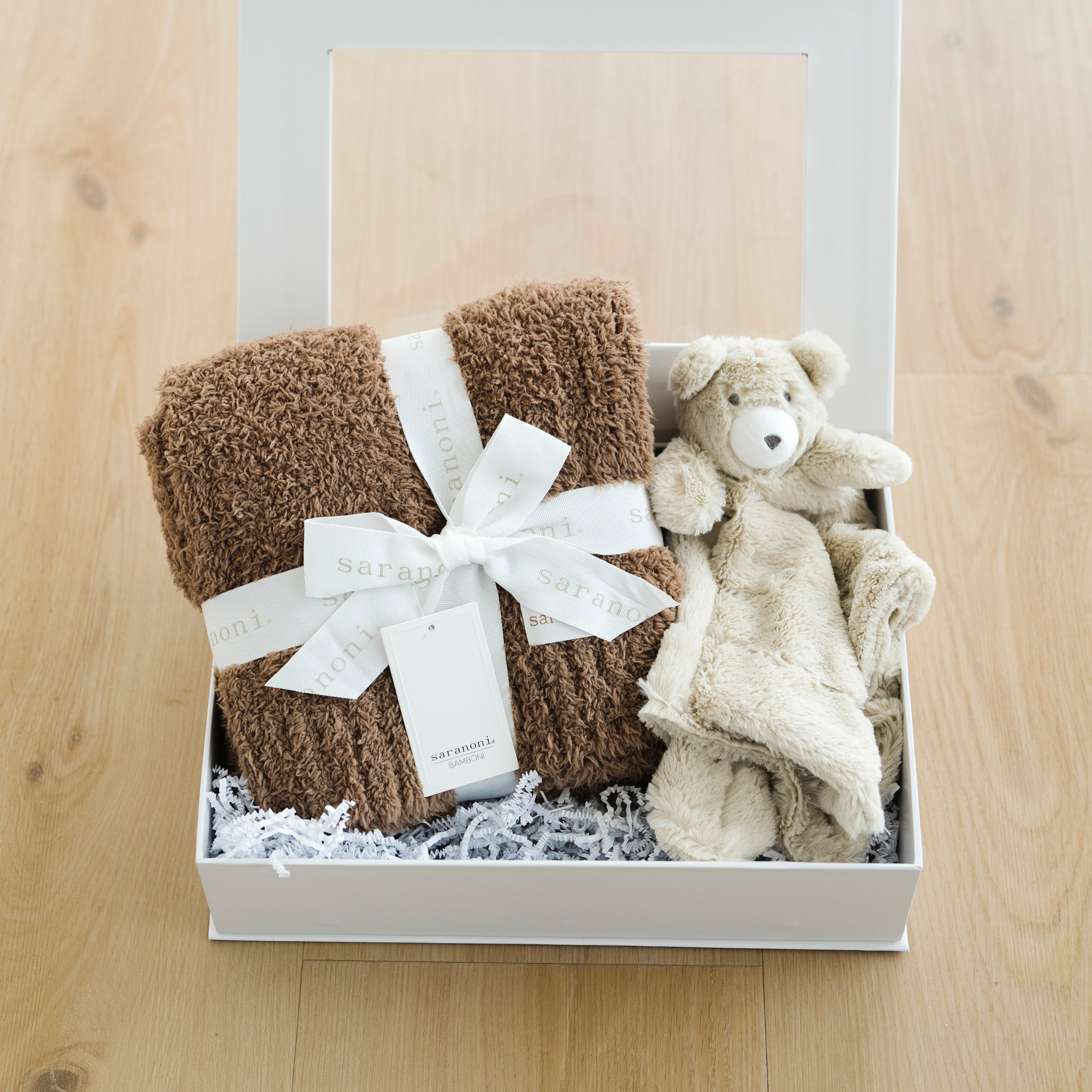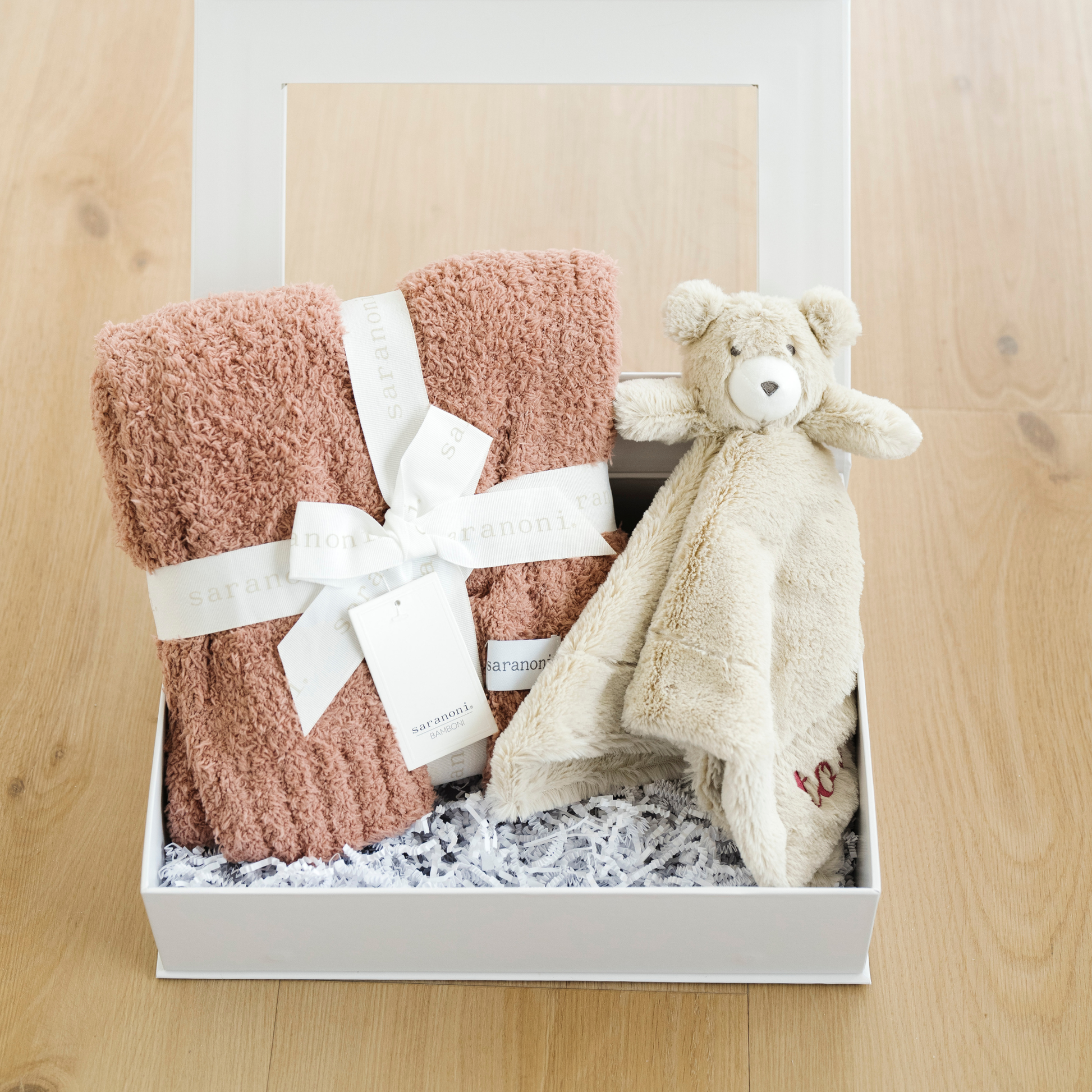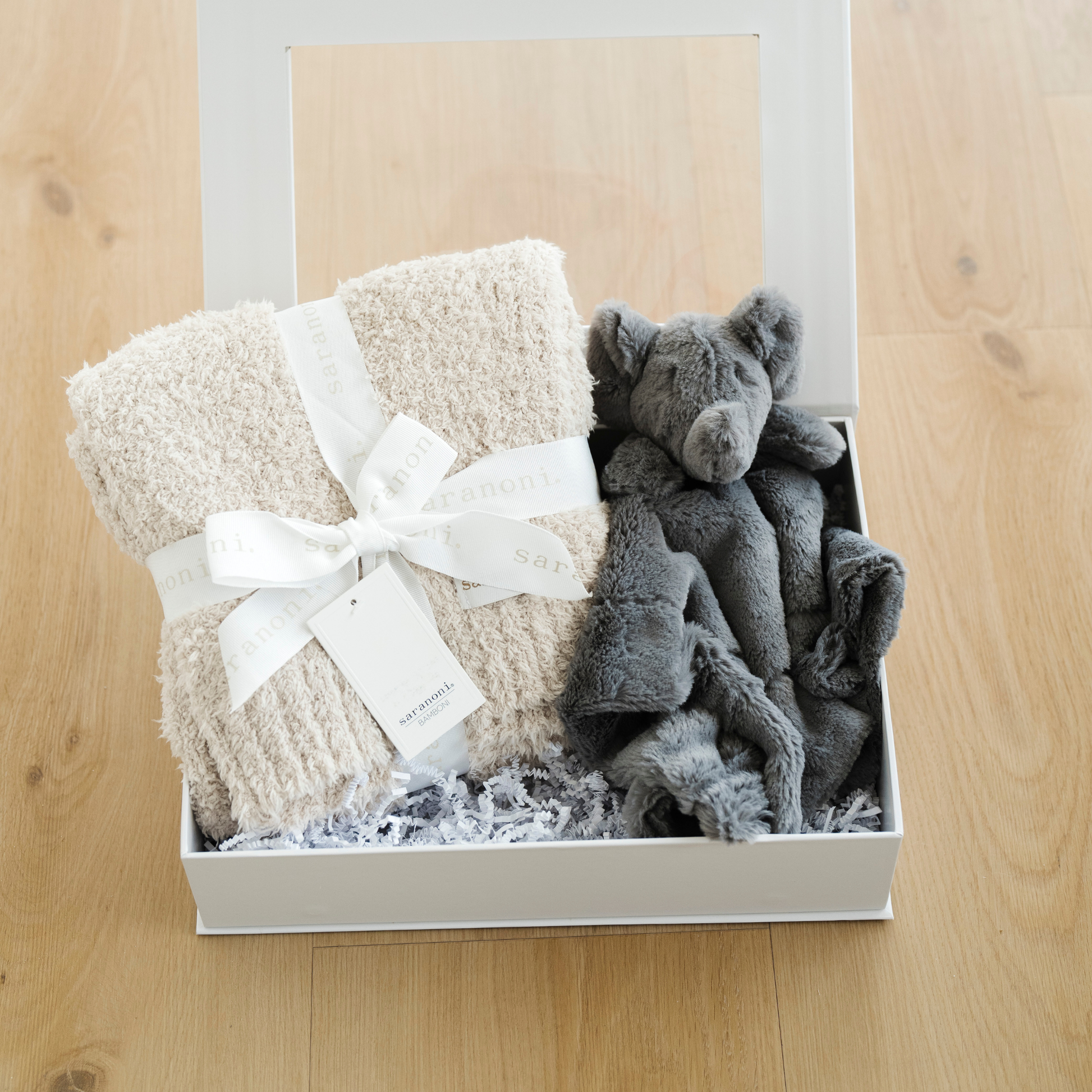 Our Sweet Beginnings Gift box comes with a Bamboni Receiving Blanket & Stuffed Animal Lovey.