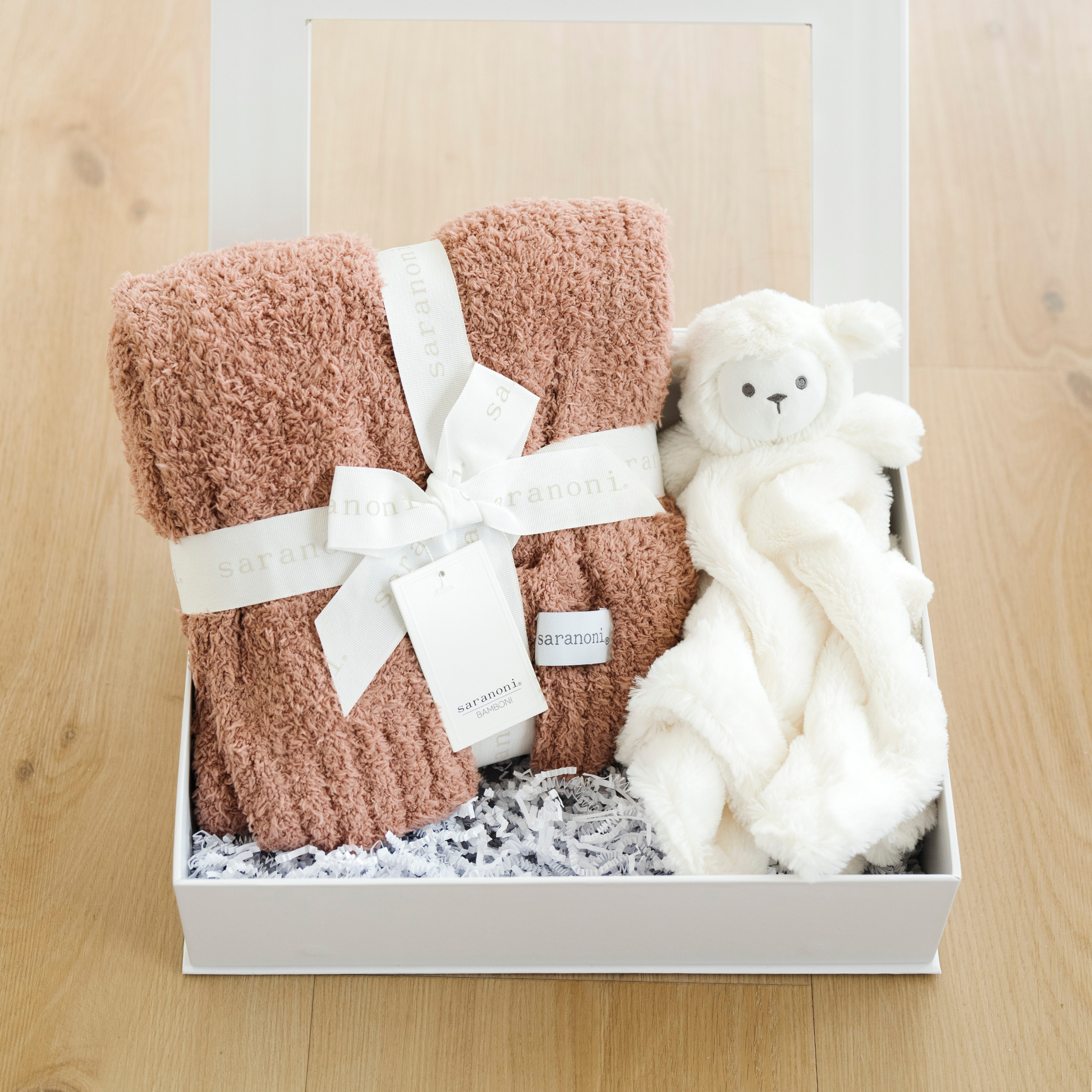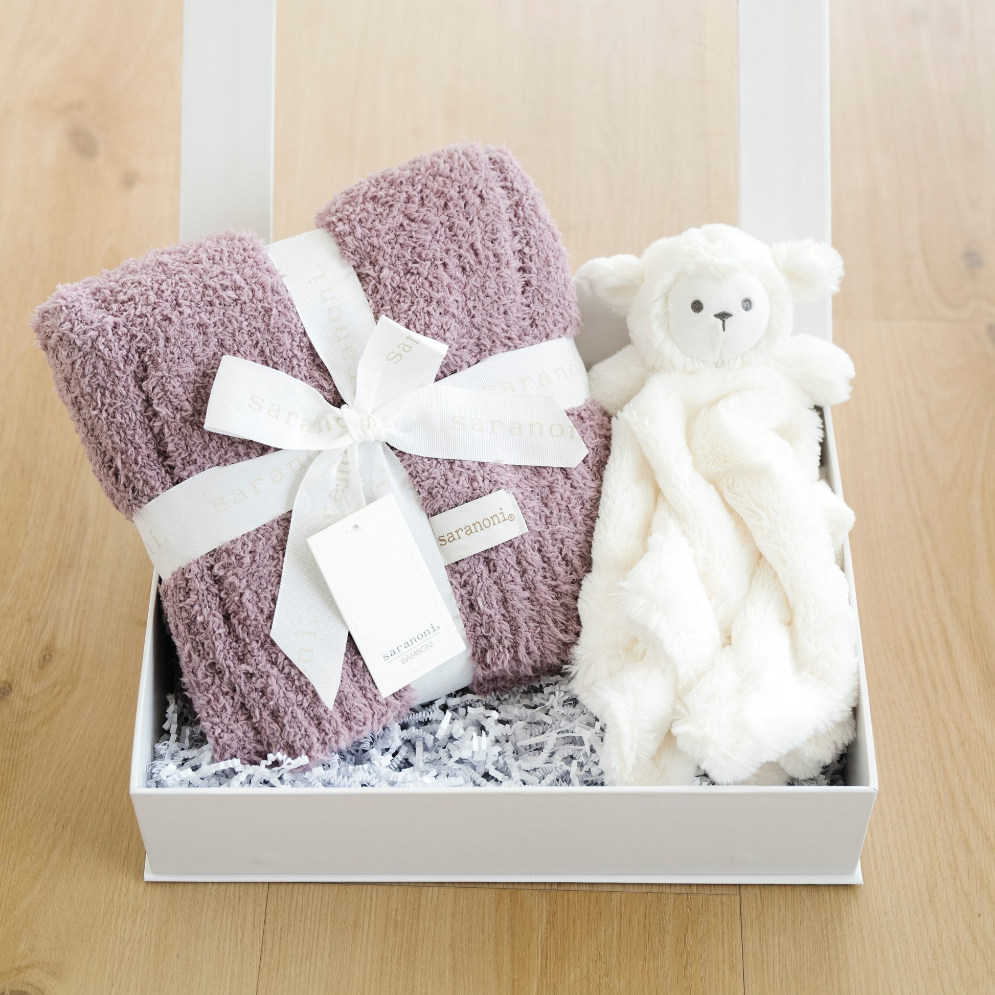 Our Sweet Beginnings Gift box comes with a Bamboni Receiving Blanket & Stuffed Animal Lovey.