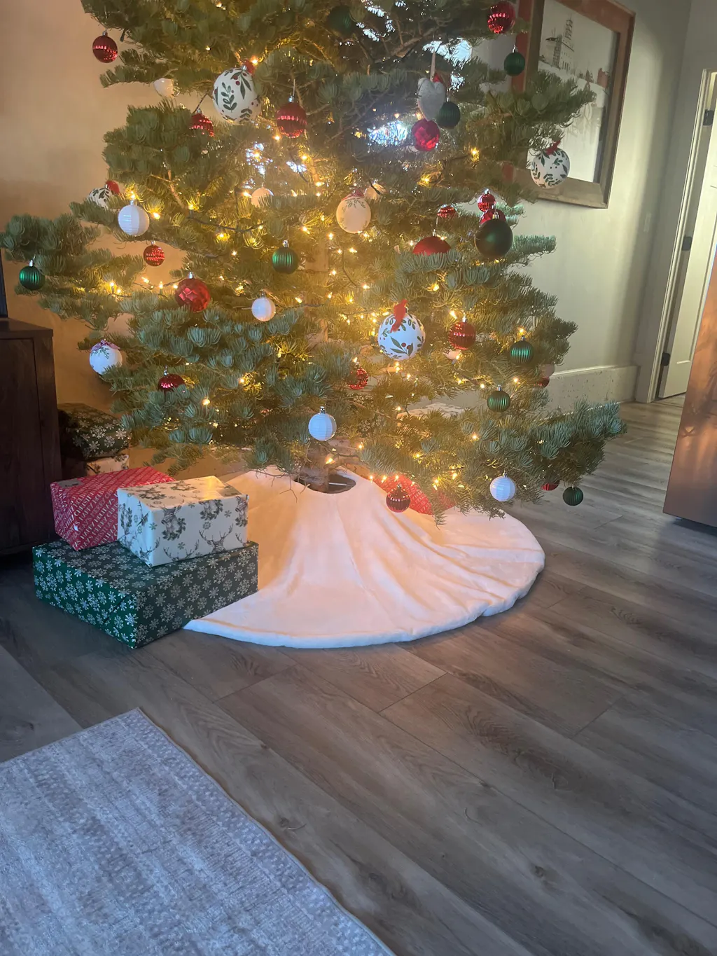 "Great size to accommodate bigger trees or overlap a bit for skinnier ones such as mine! My kids are obsessed and laid right under the tree after I put it out! It's great quality and beautiful. I got the matching stockings as well and couldn't be happier!"
