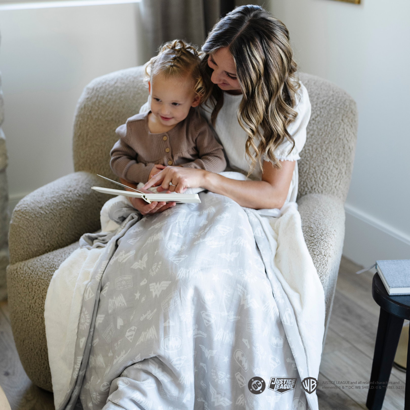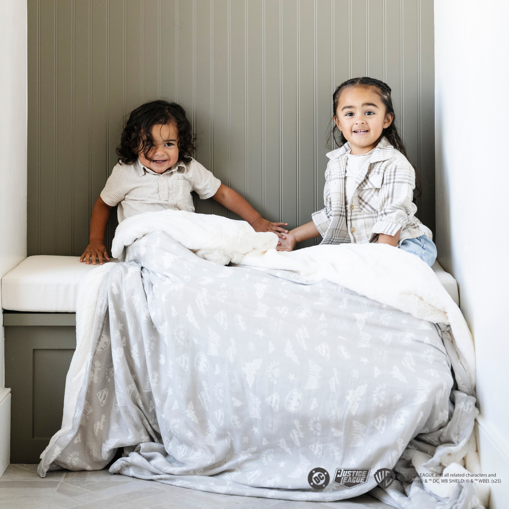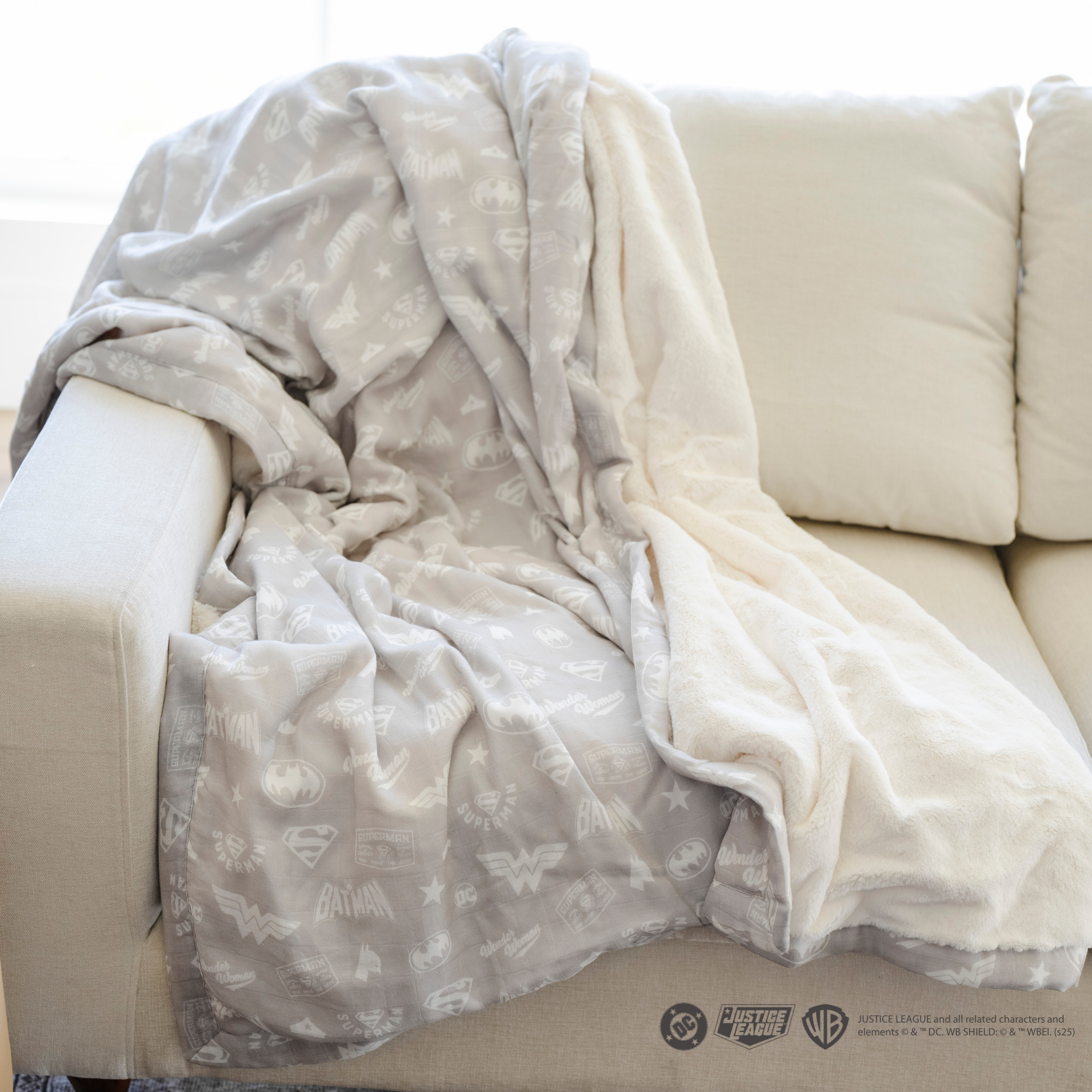 When the world needs comfort, the Justice League™ joins forces to answer the call! Featuring buttery Muslin and our signature sleek Lush, this blanket showcases all your favorite heroes in Saranoni’s signature luxurious style. Wash on cold with like colors, hang or lay flat to dry.