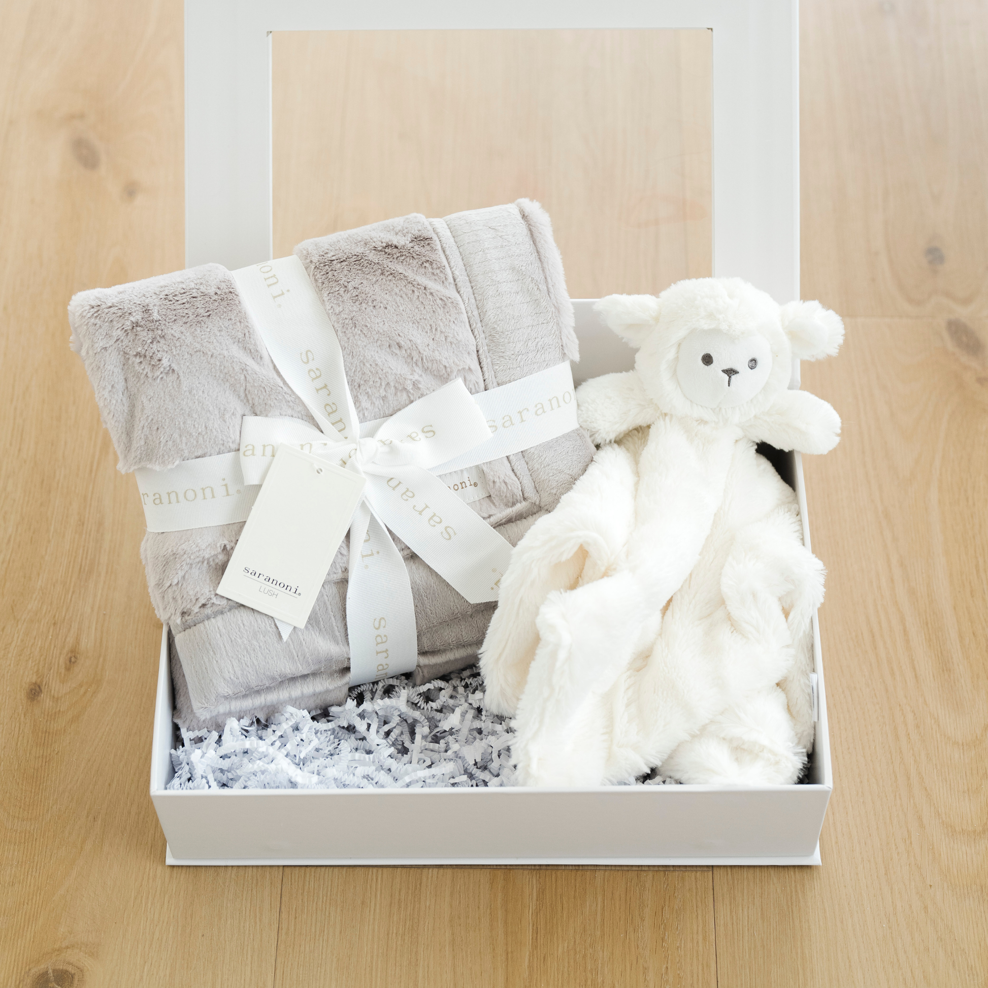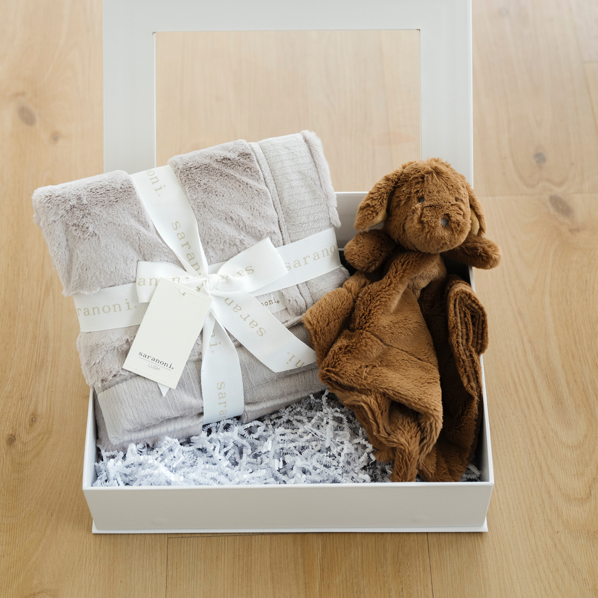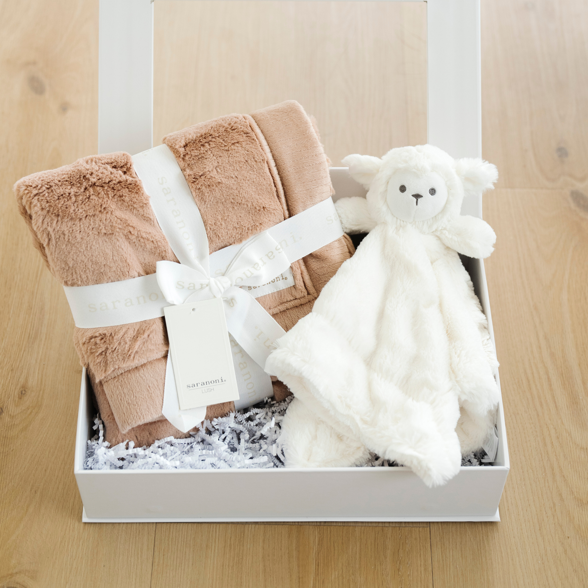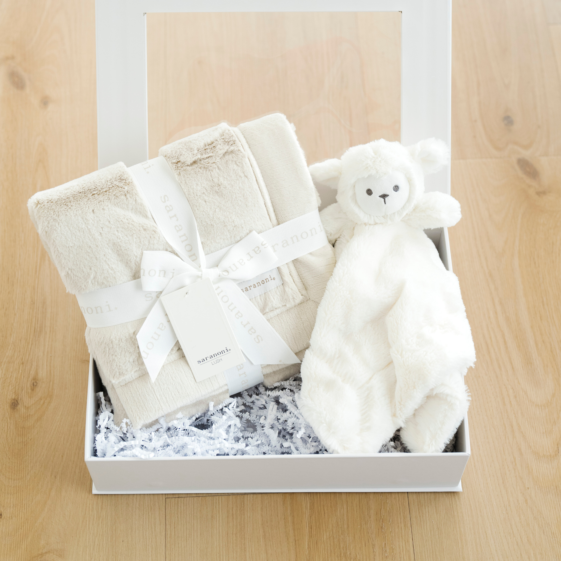 Our Sweet Beginnings Gift box comes with a Lush Receiving Blanket & Stuffed Animal Lovey.