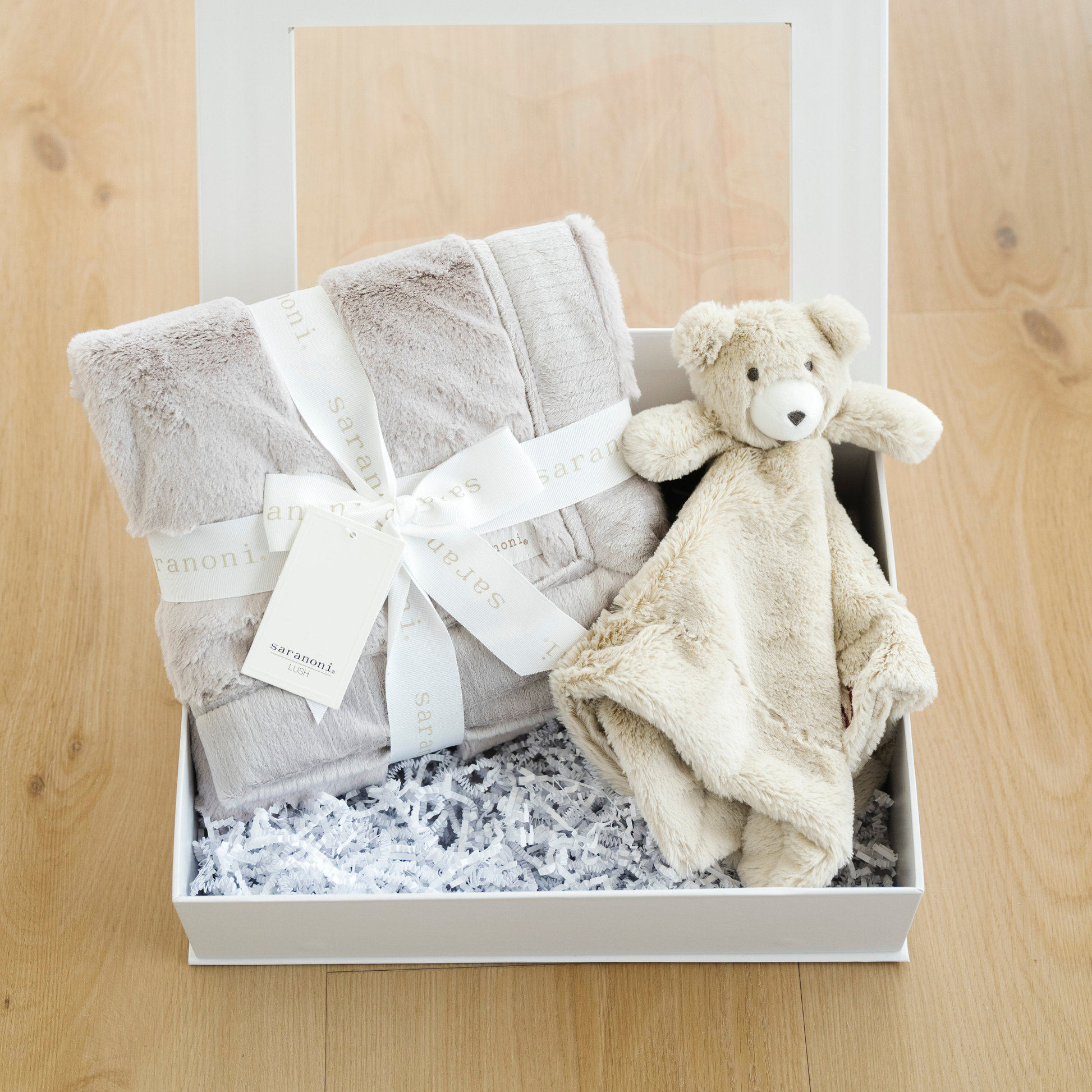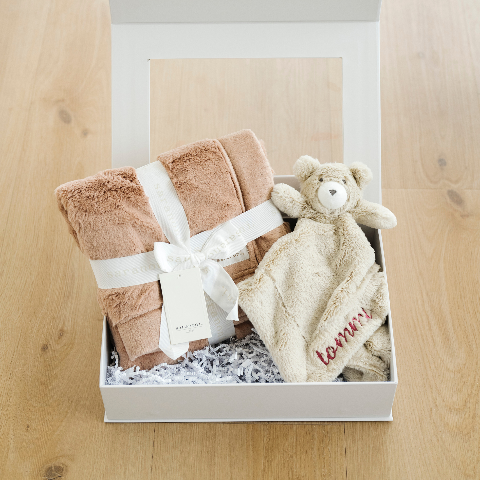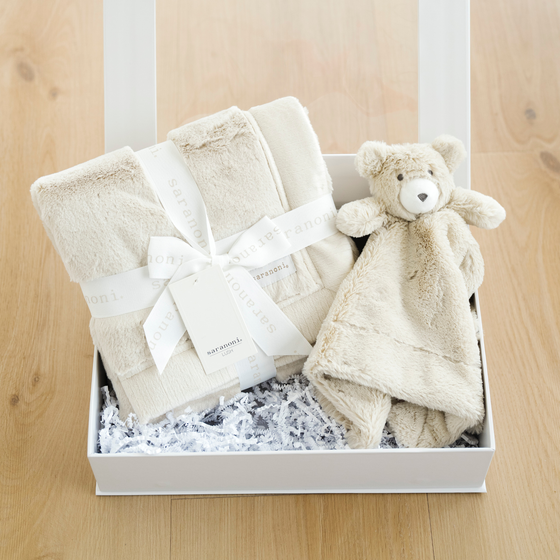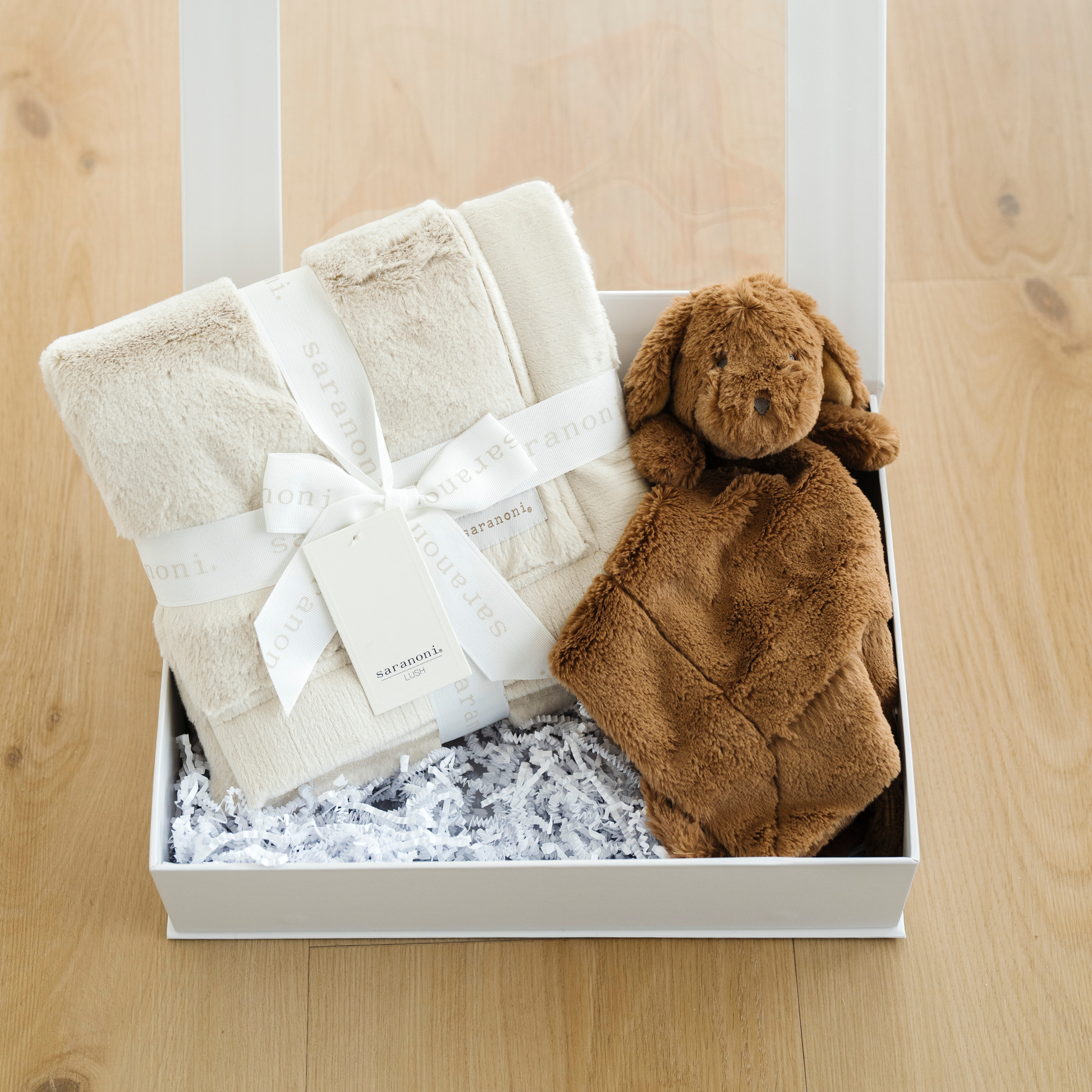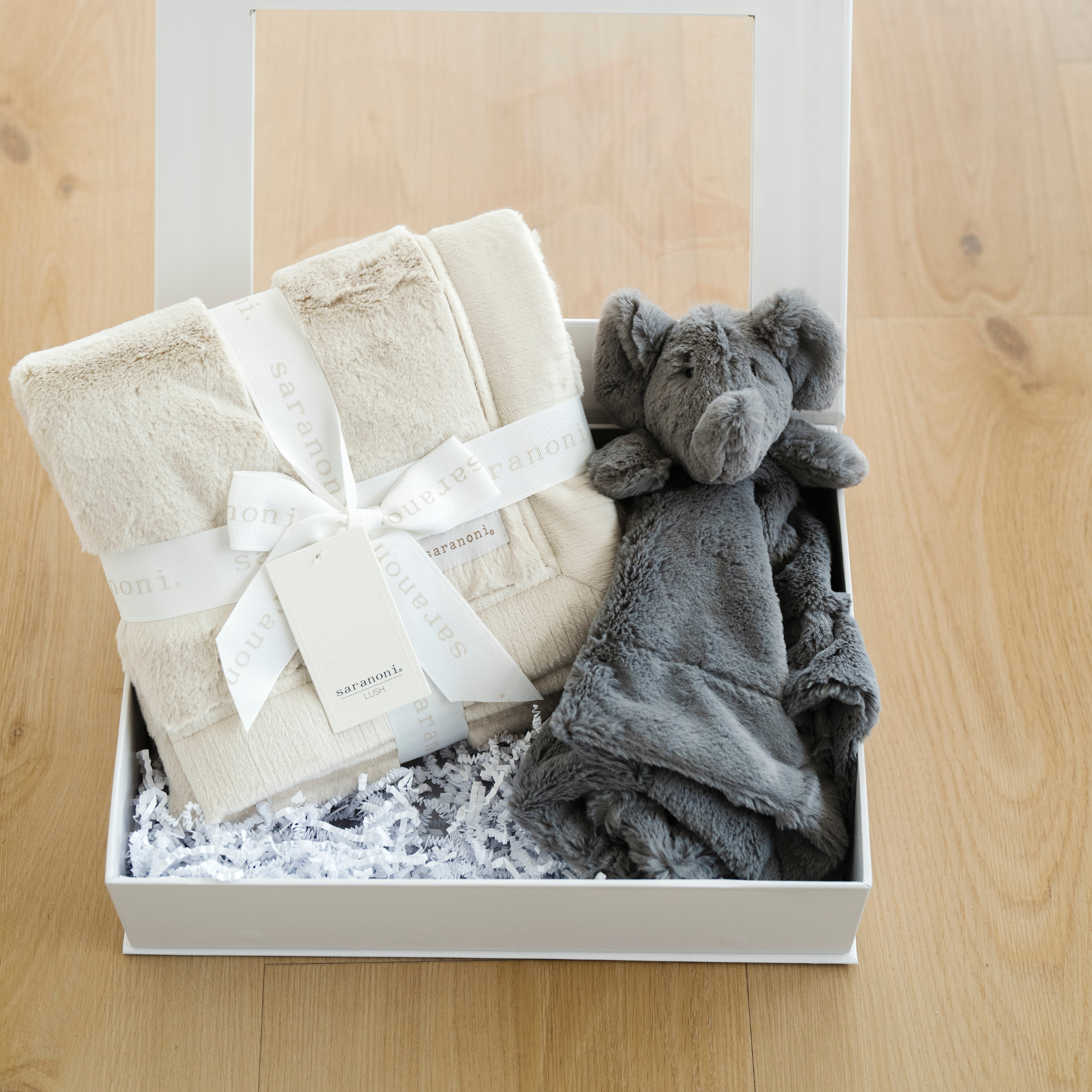 Our Sweet Beginnings Gift box comes with a Lush Receiving Blanket & Stuffed Animal Lovey.