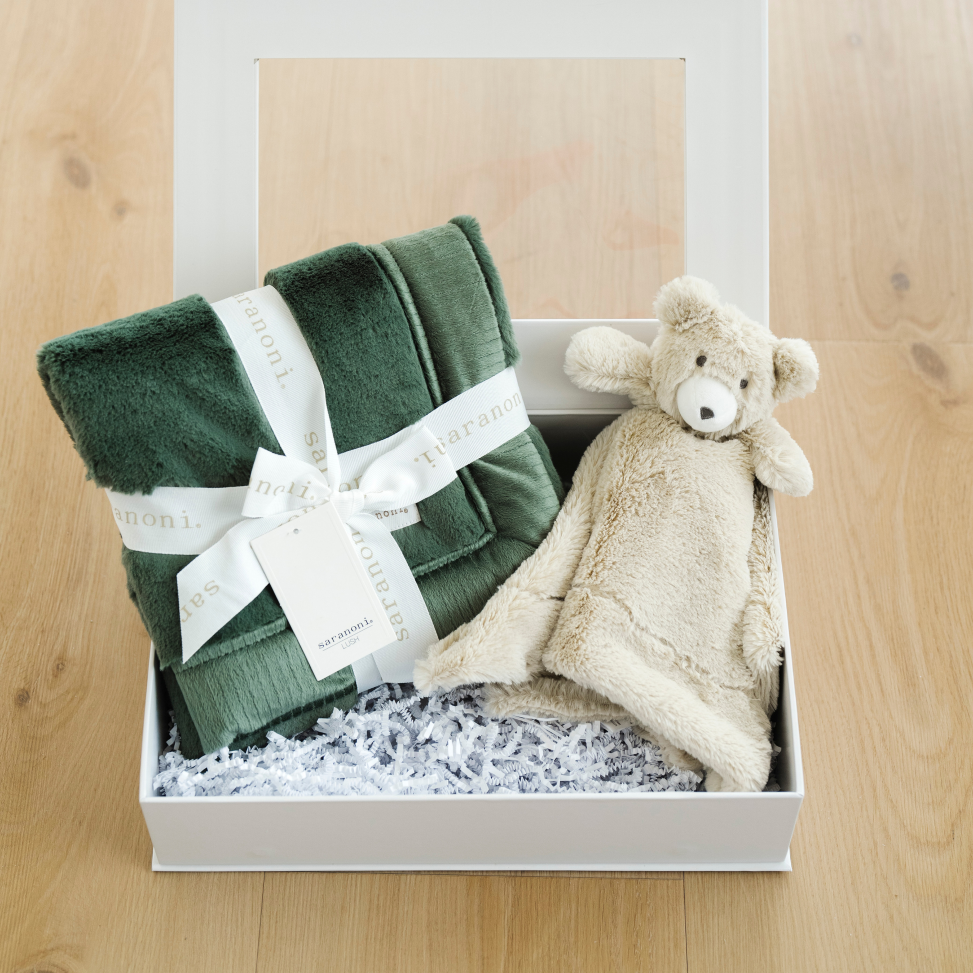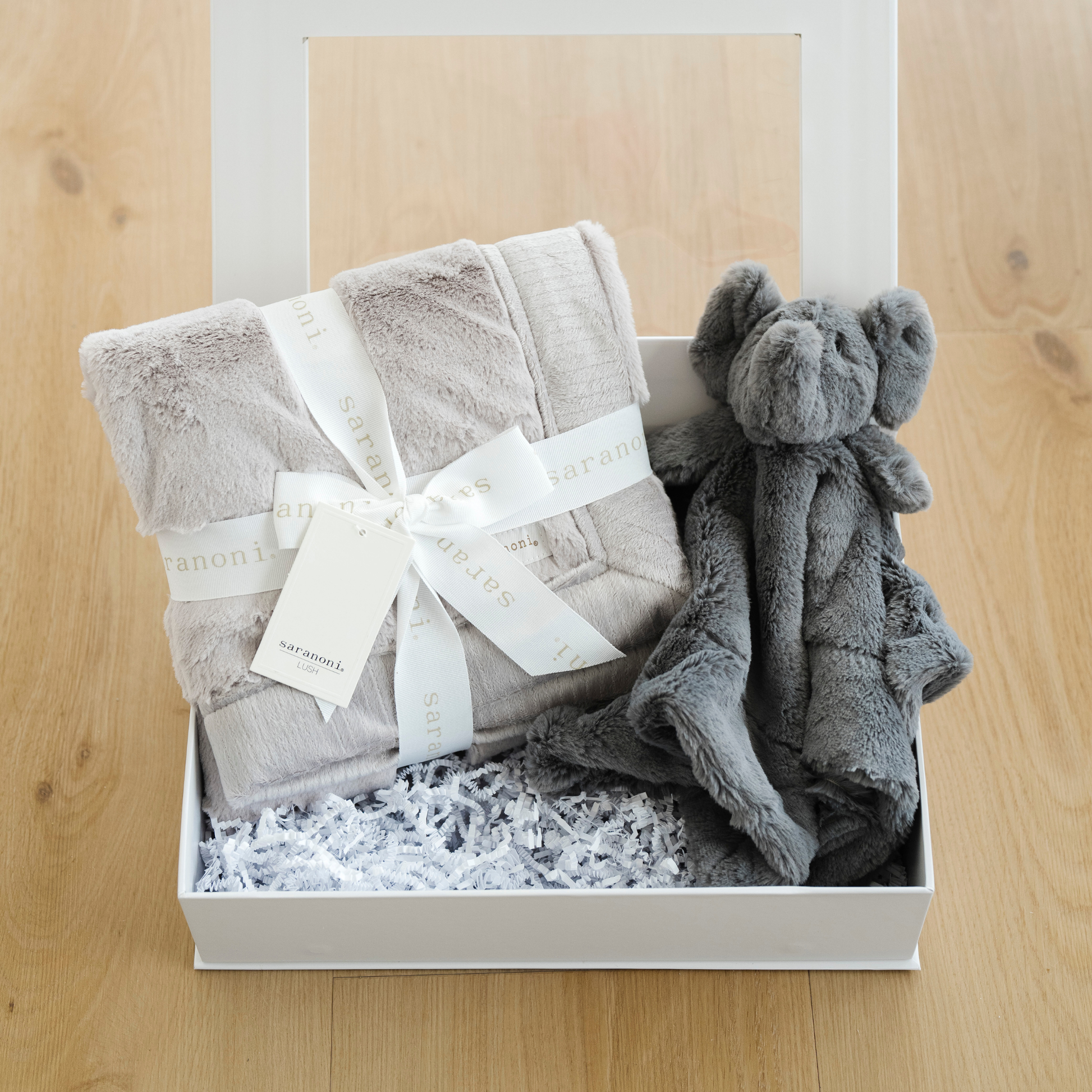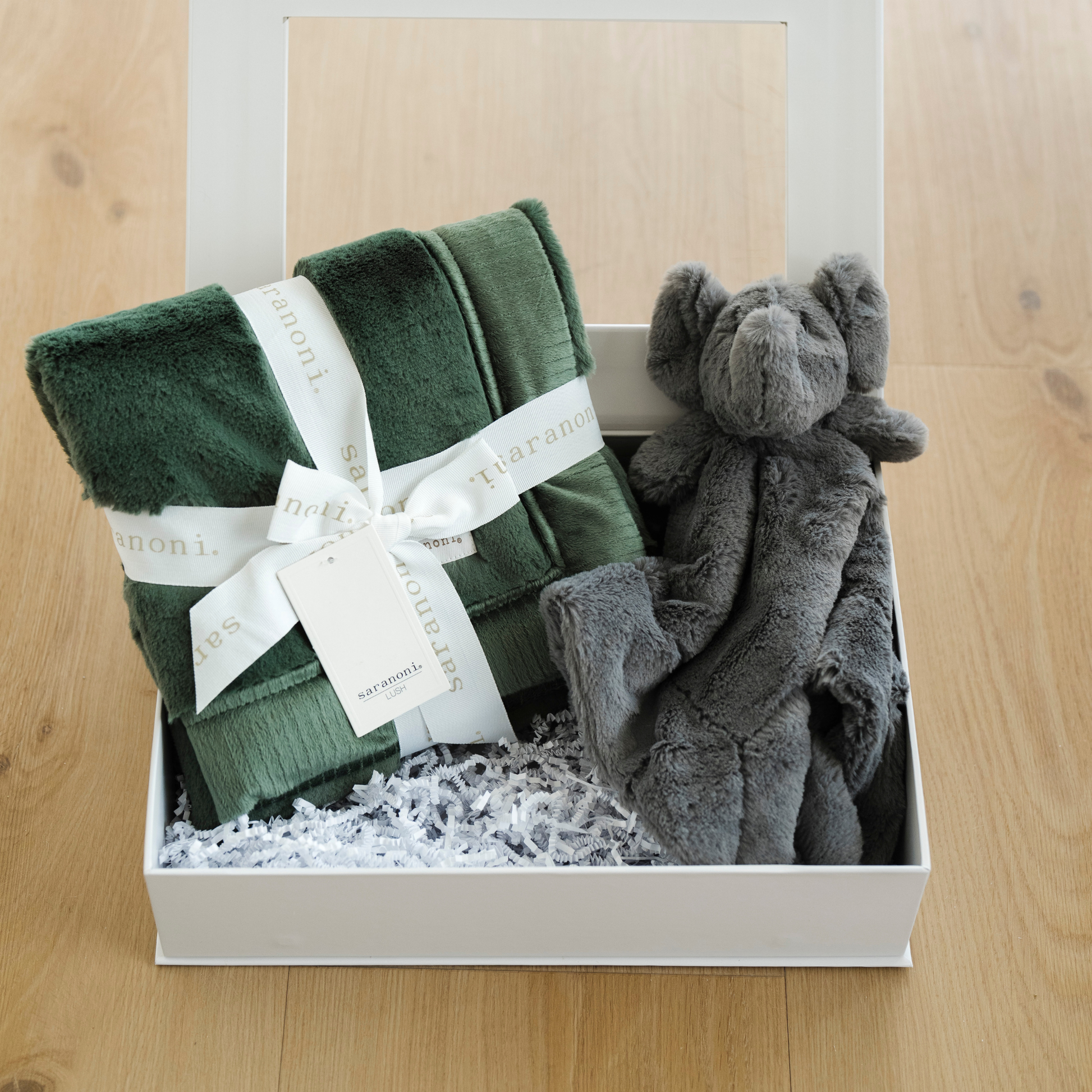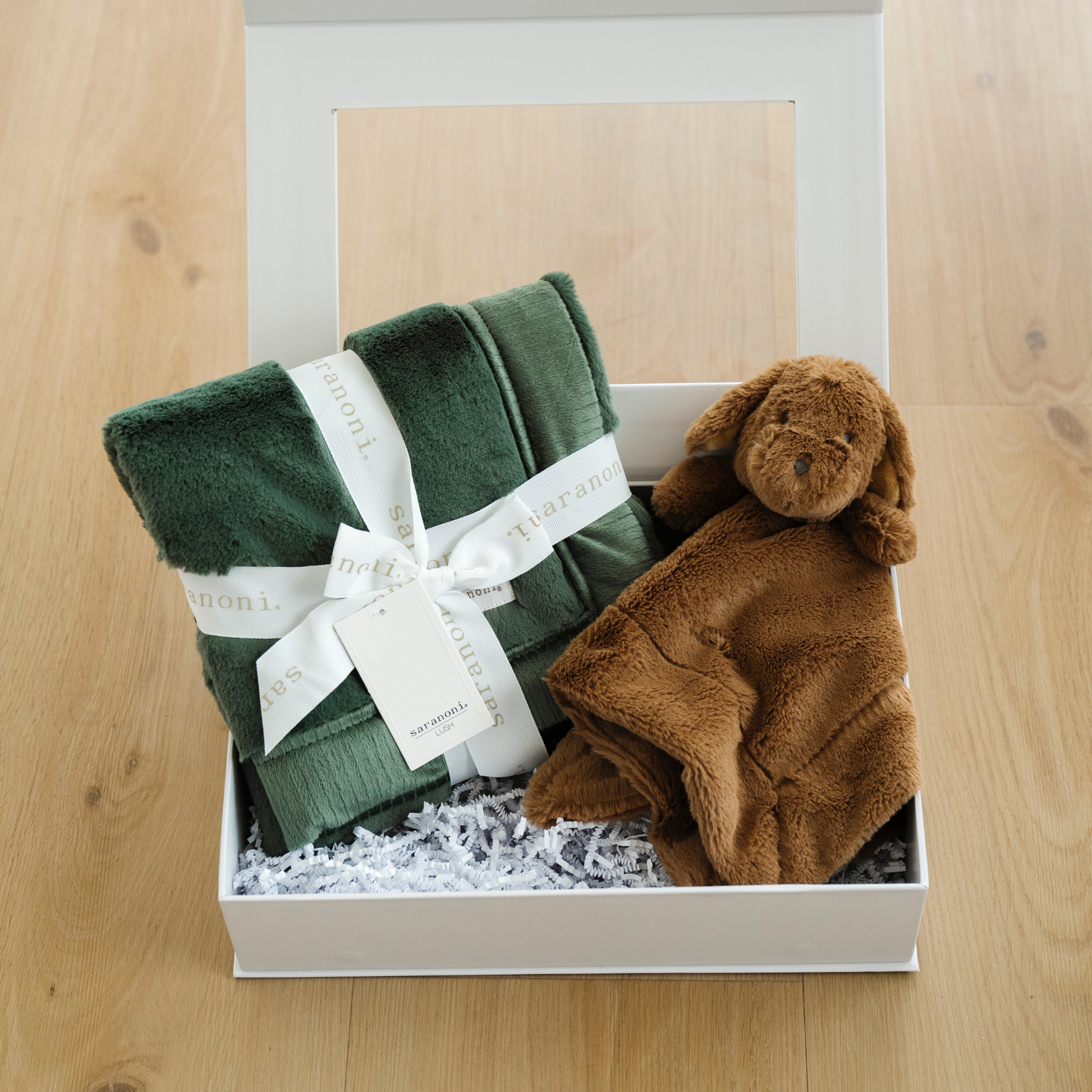 Our Sweet Beginnings Gift box comes with a Lush Receiving Blanket & Stuffed Animal Lovey.